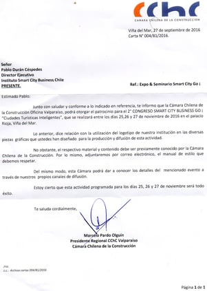 Don Marcelo Pardo Olguín - Presidente Regional CChC Valparaíso, para el Arq. Pablo Durán Céspedes para congreso Smart City GO¡ 2016 "Ciudades turísticas inteligentes", a realizarse el 25 de noviembre del 2016 en Viña del Mar.