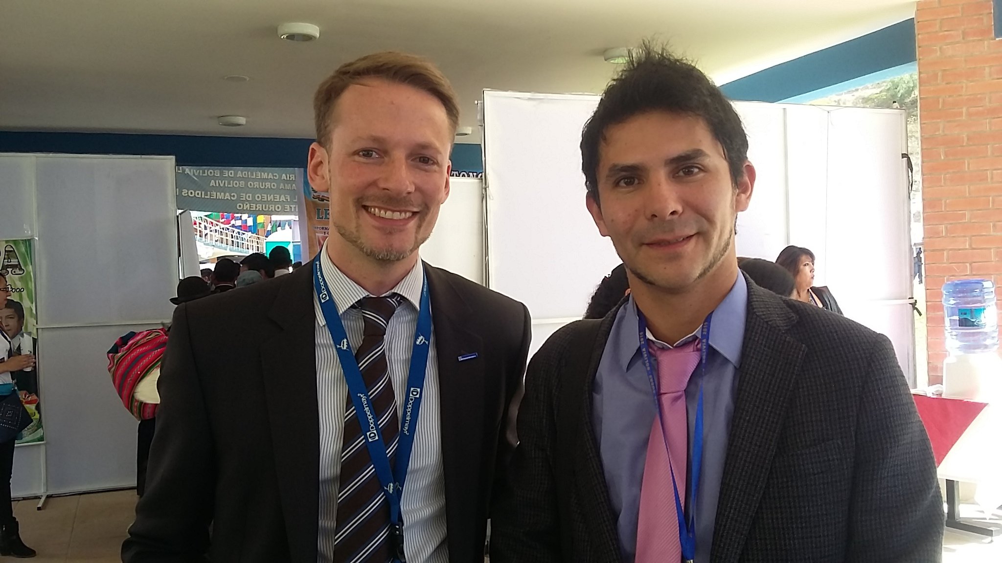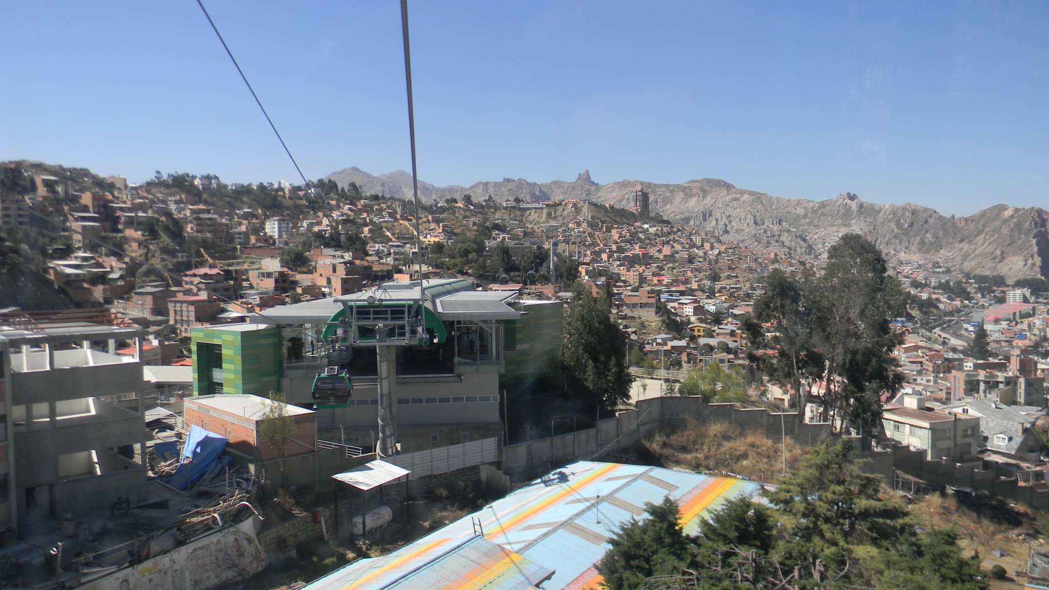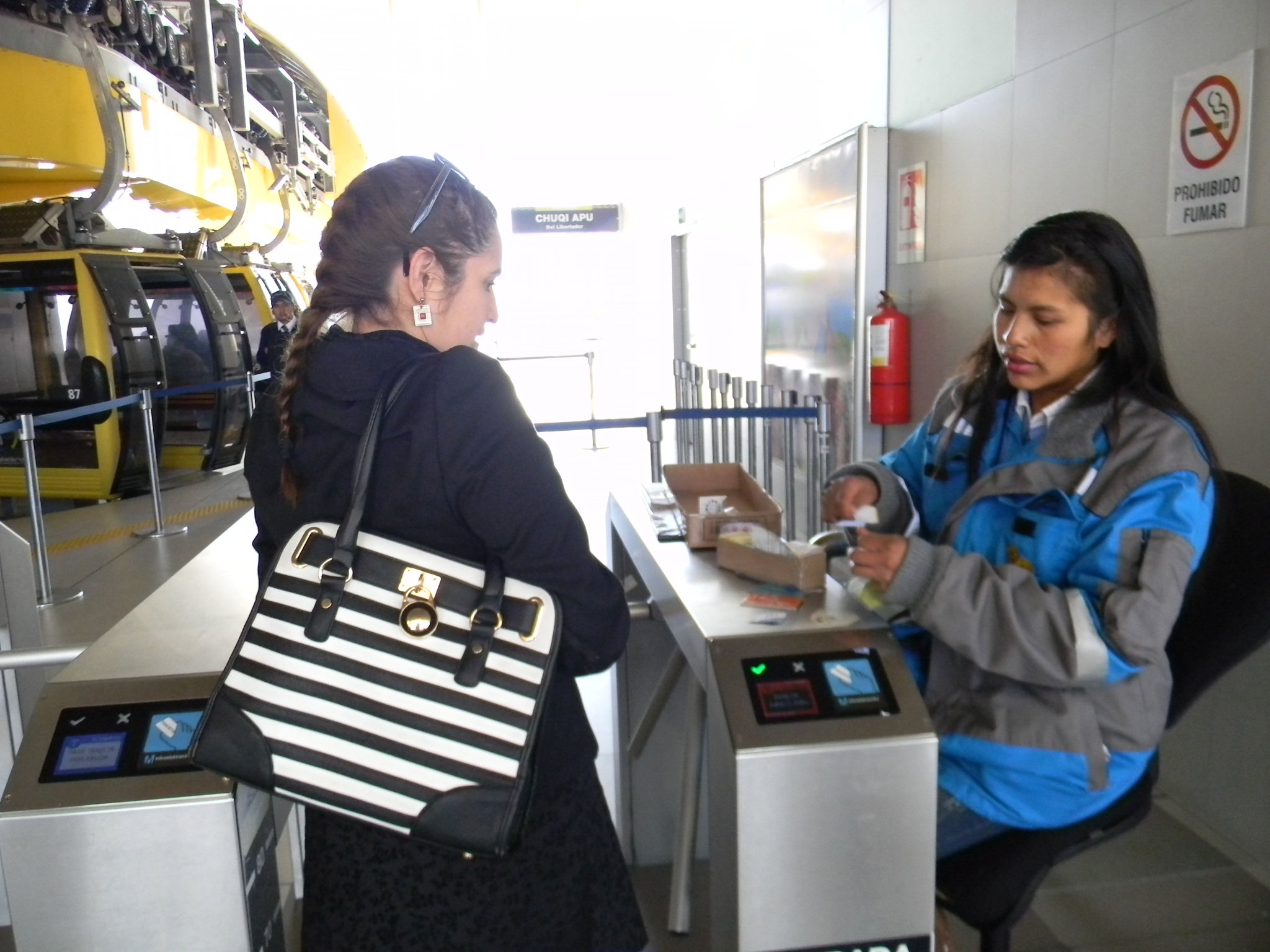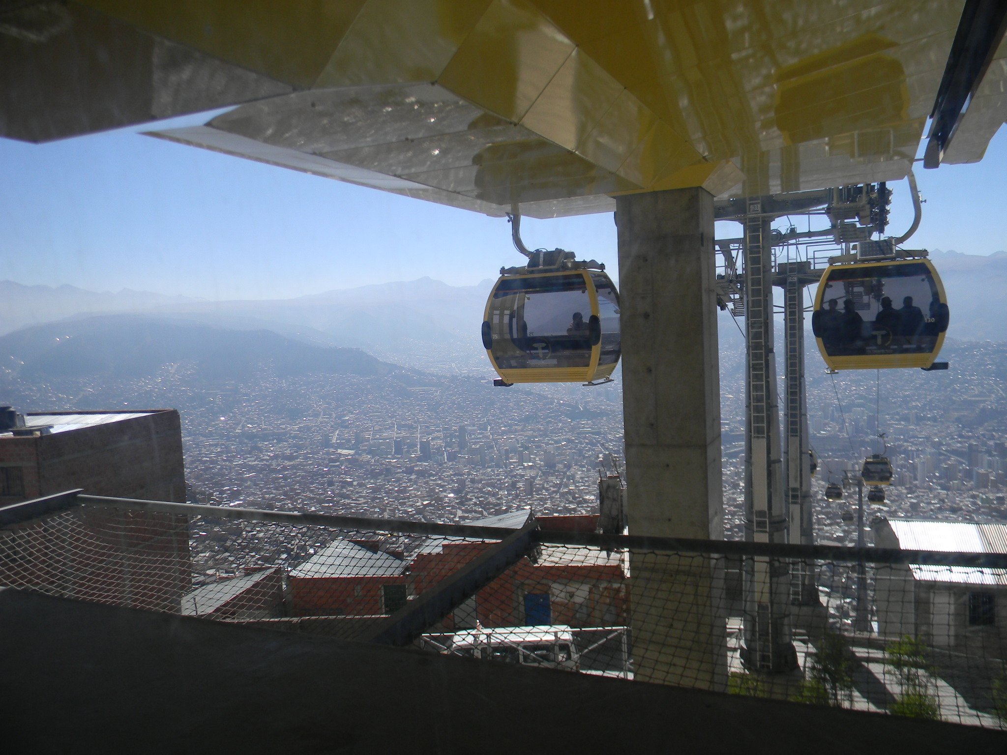 Equipo de Smart CityB-Chile, Visita Teleférico en la Paz - Bolivia, en reunión con Doppelmayr. Sistema inteligente de movilidad urbana aéreo por cable, que une las ciudades de La Paz y El Alto. Tiene una capacidad máxima de 6000 pasajeros por hora (subida y bajada) por línea y 443 cabinas distribuidas en las 3 líneas. 10 pasajeros por cabina, 22 seg. de frecuencia. Desciende desde 4008 msnm, hasta 3200 msnm. Aprox. La línea amarilla y verde se unen en un recorrido de 7.7 km.