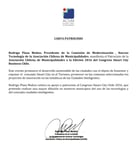 Rodrigo Plaza Muñoz, Presidente de la Comisión de Modernización, Nuevas Tecnologías de la Asociación Chilena de Municipalidades AChM, manifiesta el patrocinio a la edición 2016 de Congreso Smart City Business Turismo y acciones de difusión por Tour recorriendo Chile.
